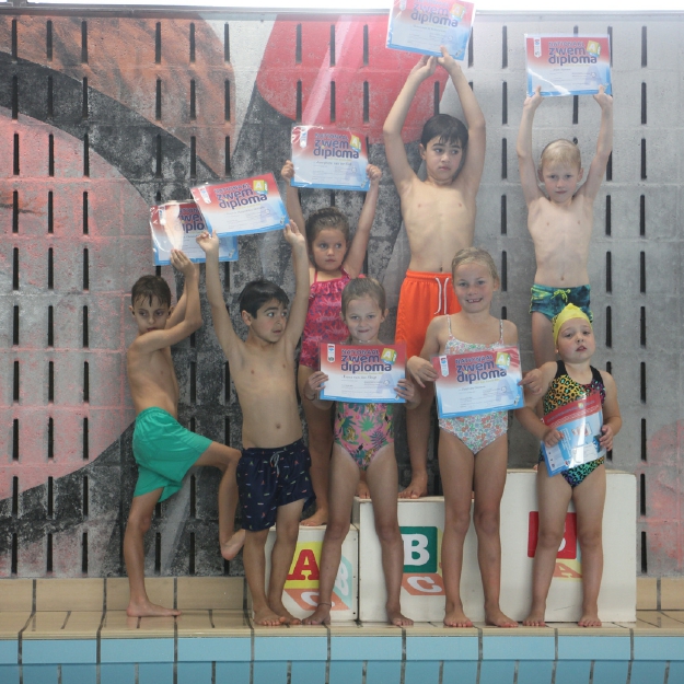 Het afzwemmen kon eindelijk weer doorgaan na de lange zomervakantie. Ouders, grootouders en broers/zussen zaten allemaal langs de badrand. De kinderen lieten vol trots alle zwemslagen zien en ieder kind behaalde een mooi diploma.